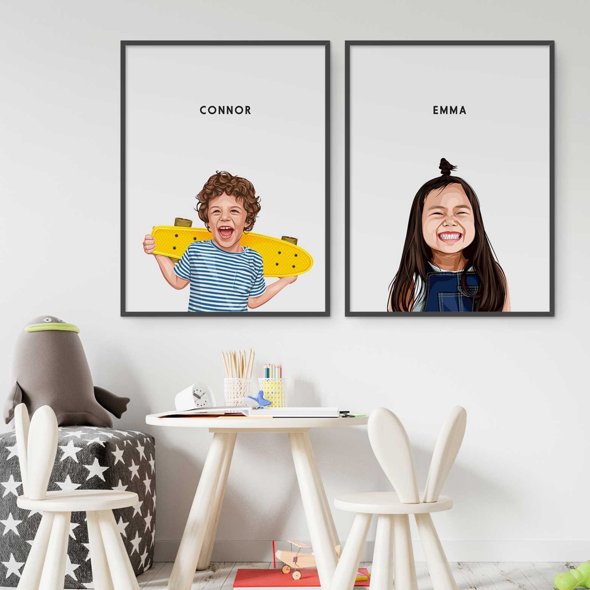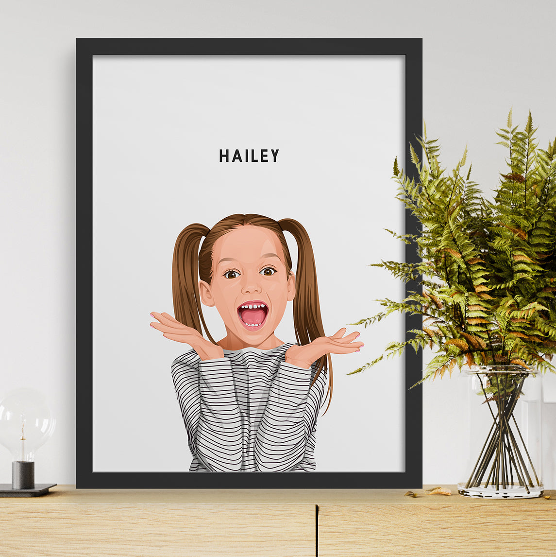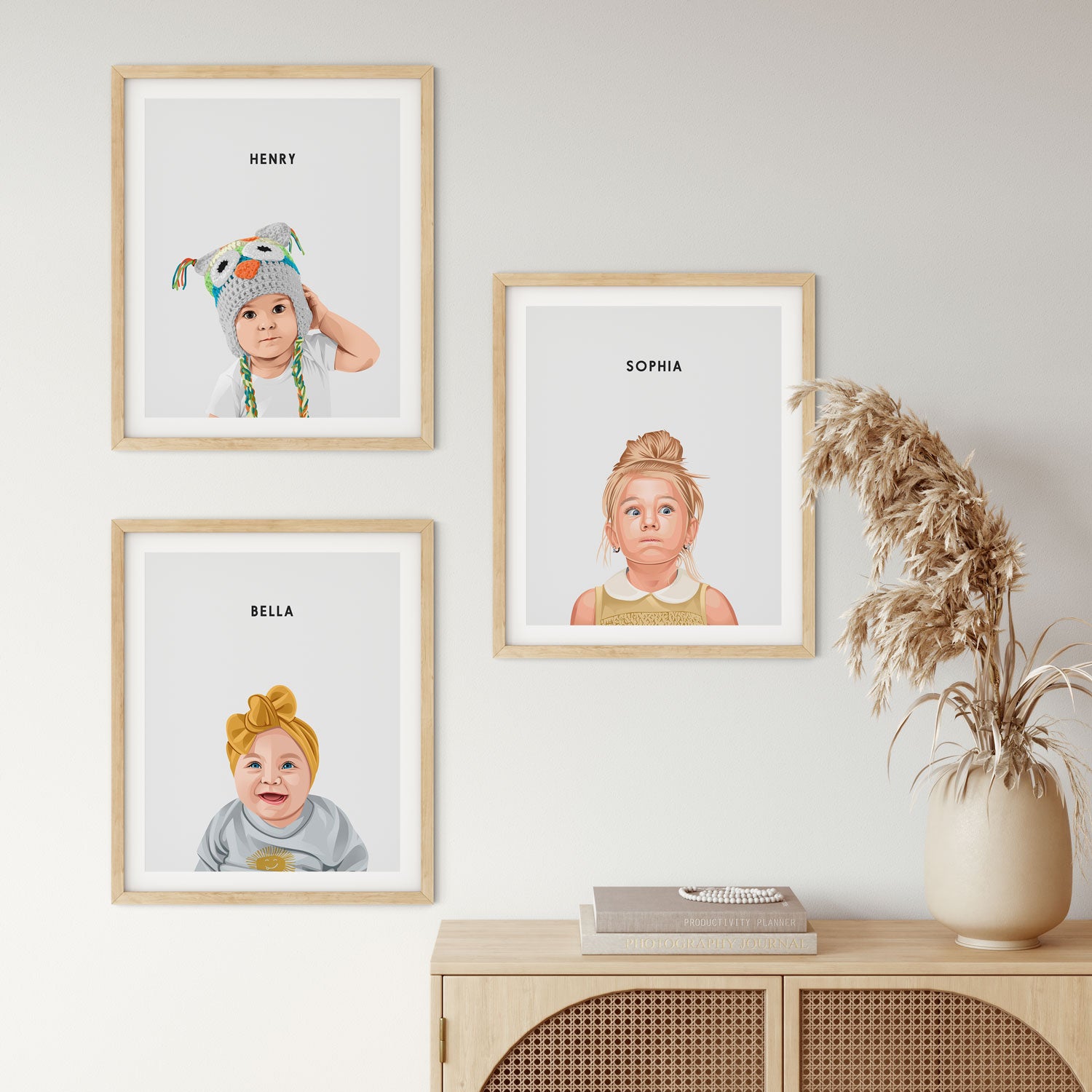 Transform a precious moment into a custom illustrated portrait! Smirky's custom baby & kid portraits are digitally-illustrated by our talented artists and expertly printed on museum-quality paper that will give your art a polished and professional look. 1" hardwood frames come in a variety of sizes and ready-to-hang.