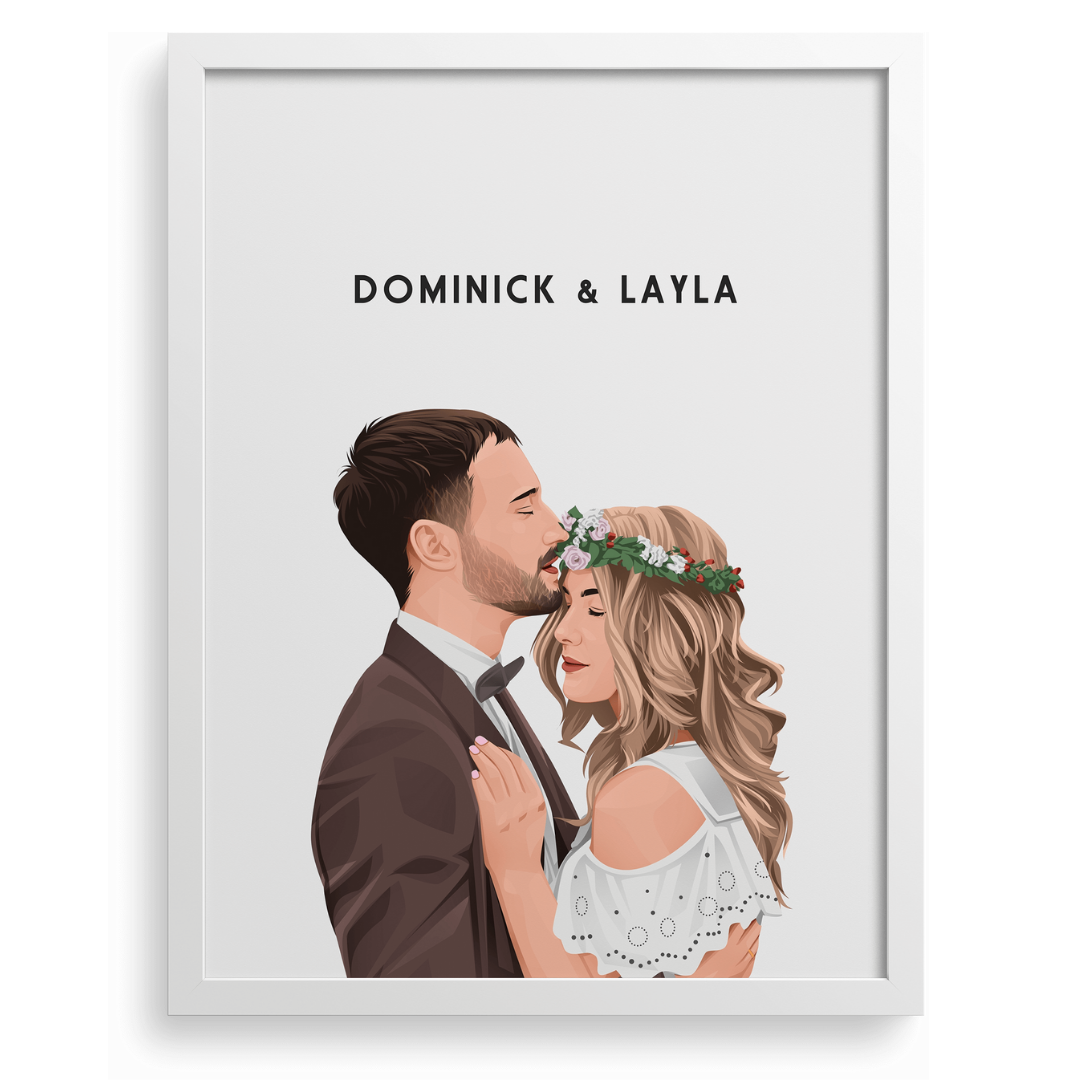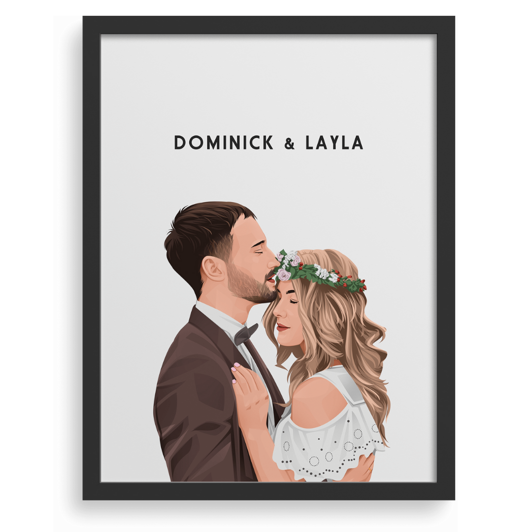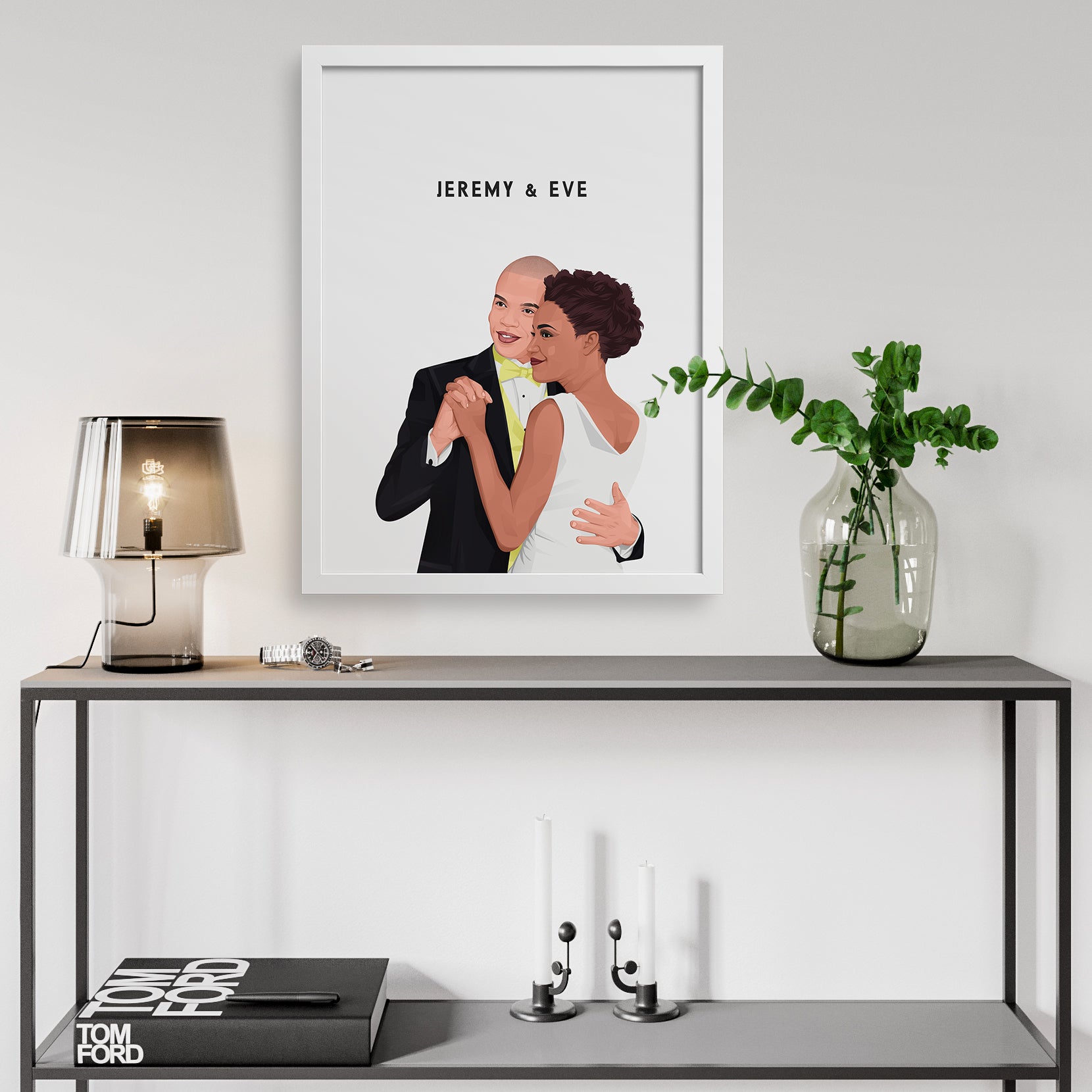 Transform a precious moment into a custom illustrated portrait! Smirky's custom wedding & anniversary portraits are digitally-illustrated by our talented artists and expertly printed on museum-quality paper that will give your art a polished and professional look. 1" hardwood frames come in a variety of sizes and ready-to-hang.