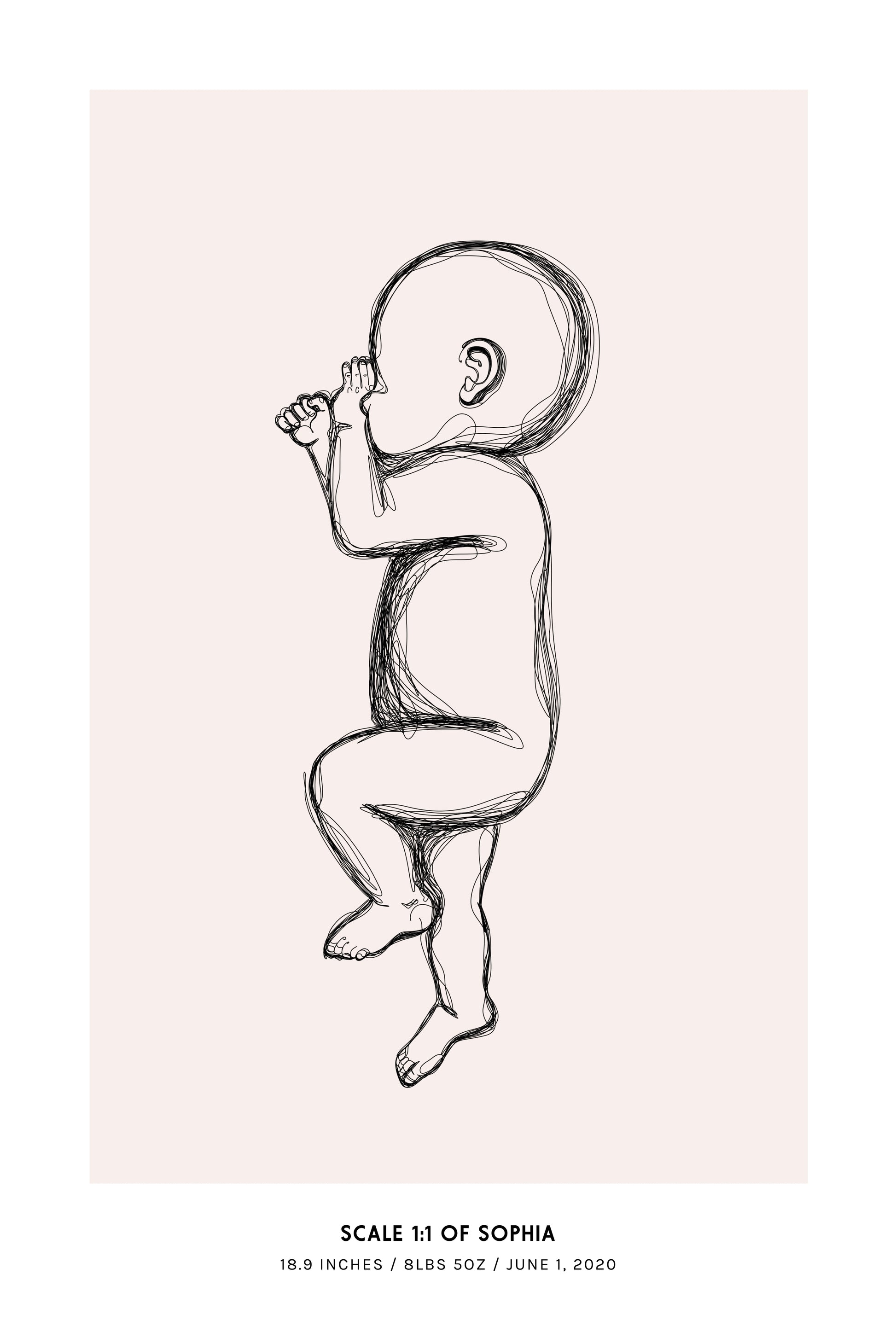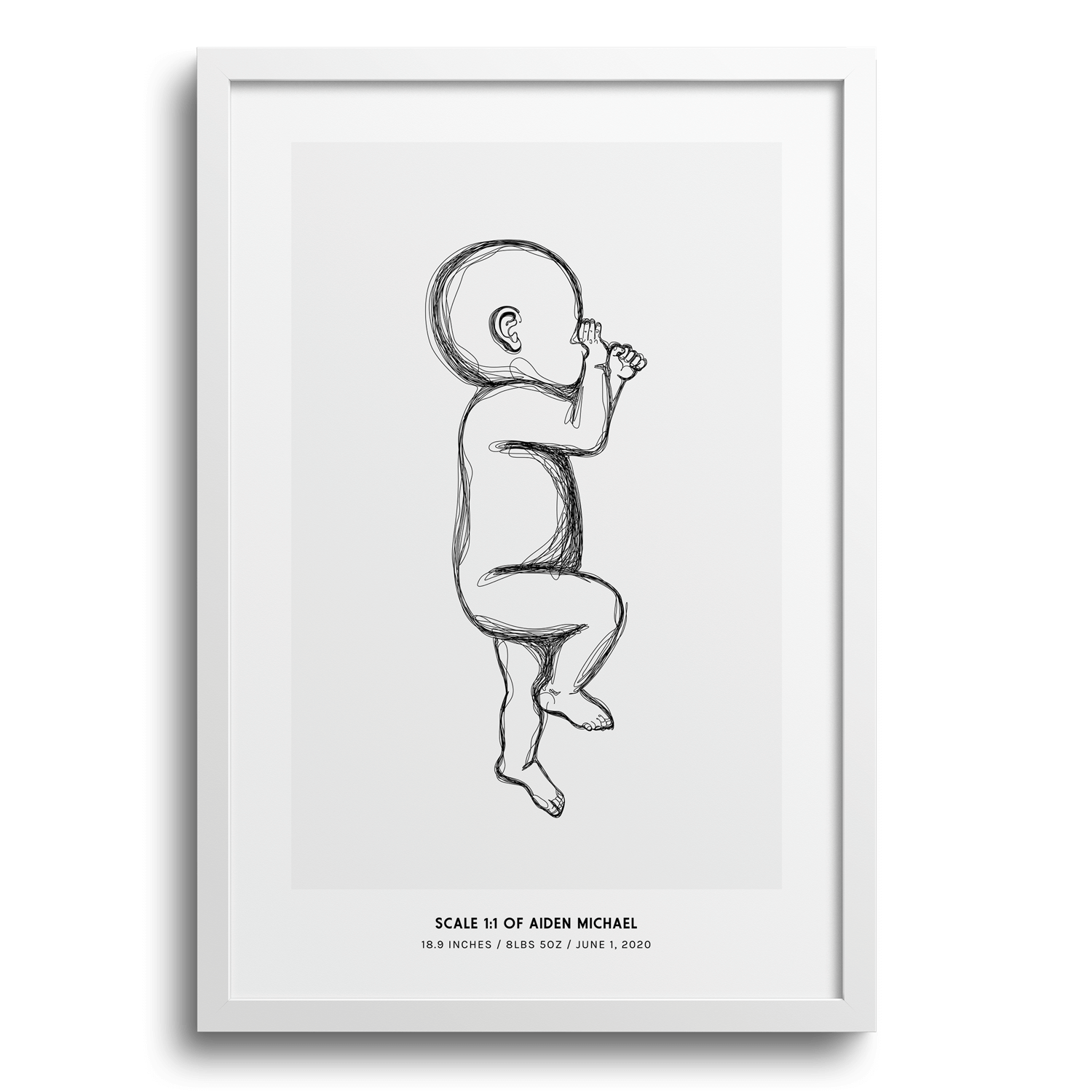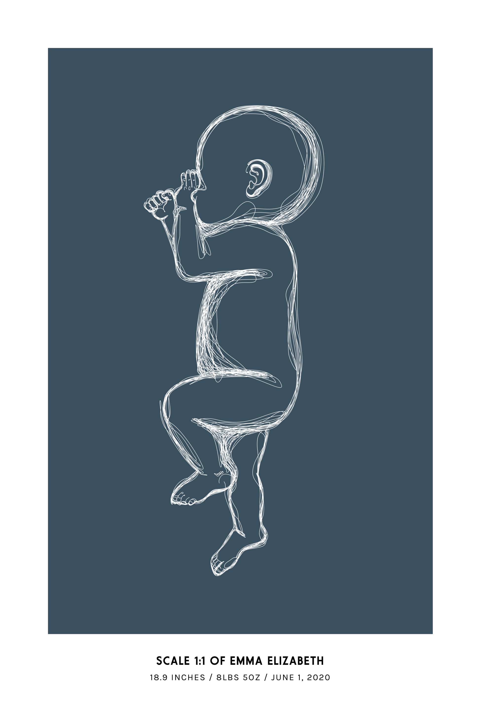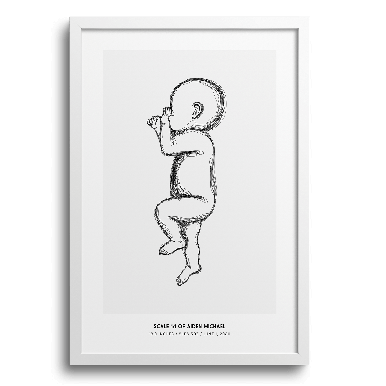 - Scaled 1:1. Actual size of your baby at birth - if your baby was 19 inches, we will print your illustration at 19 inches.