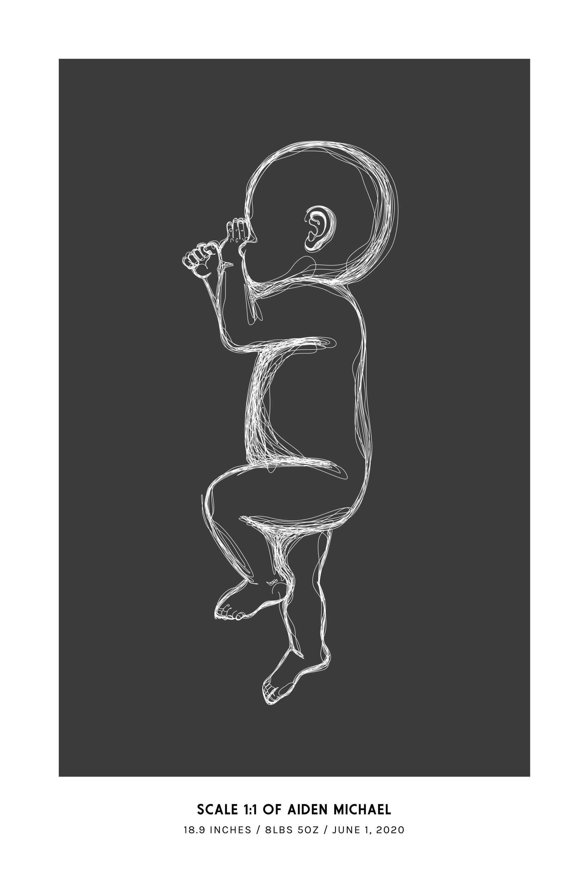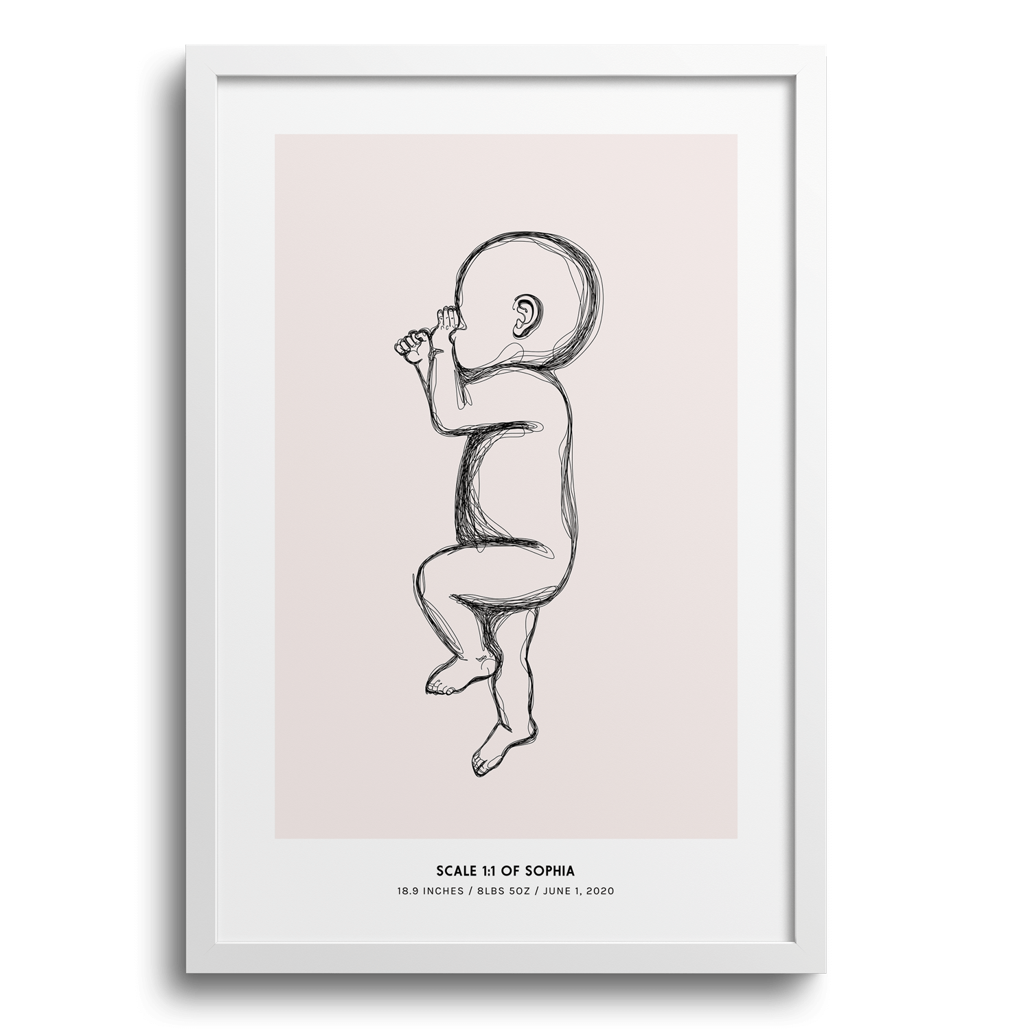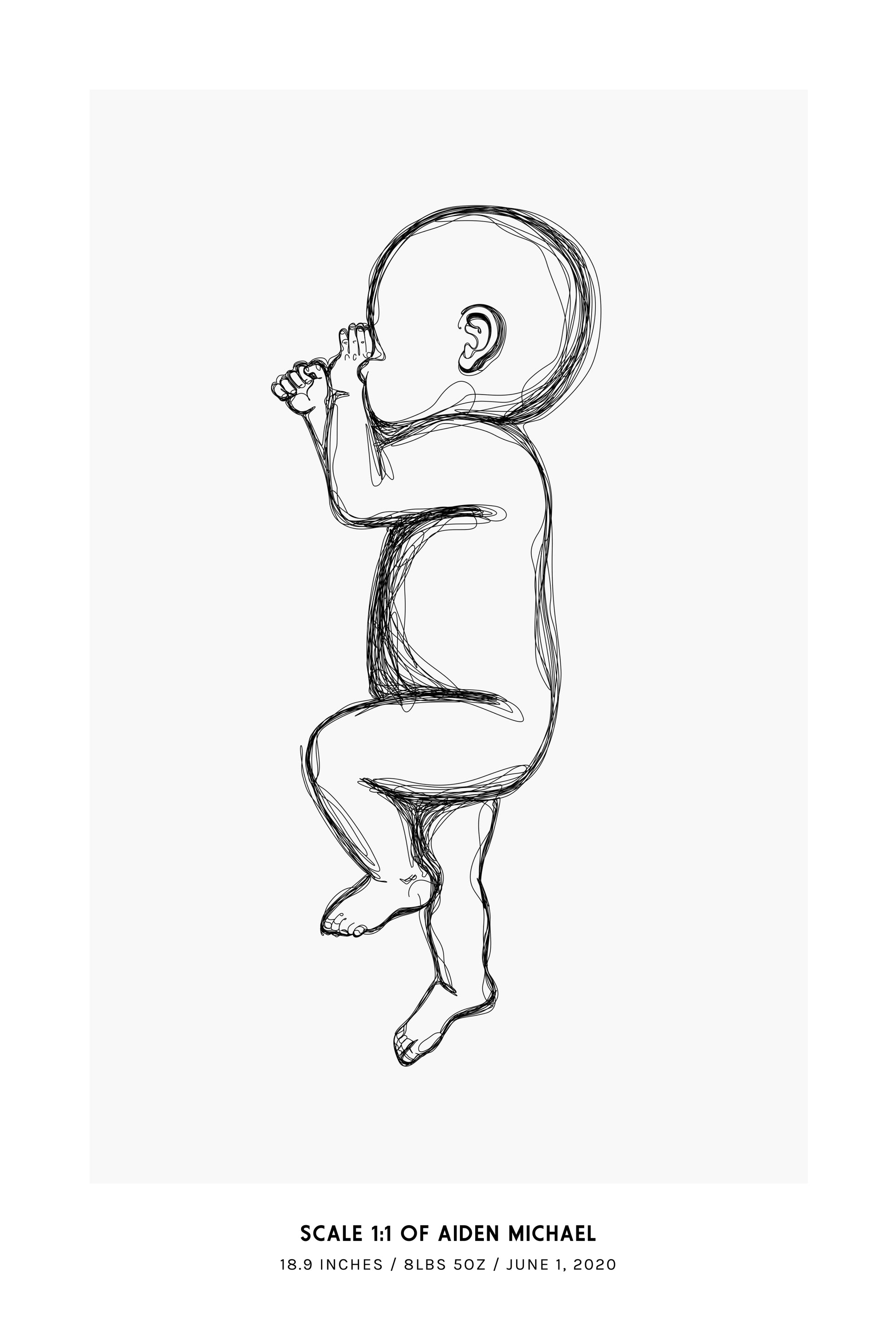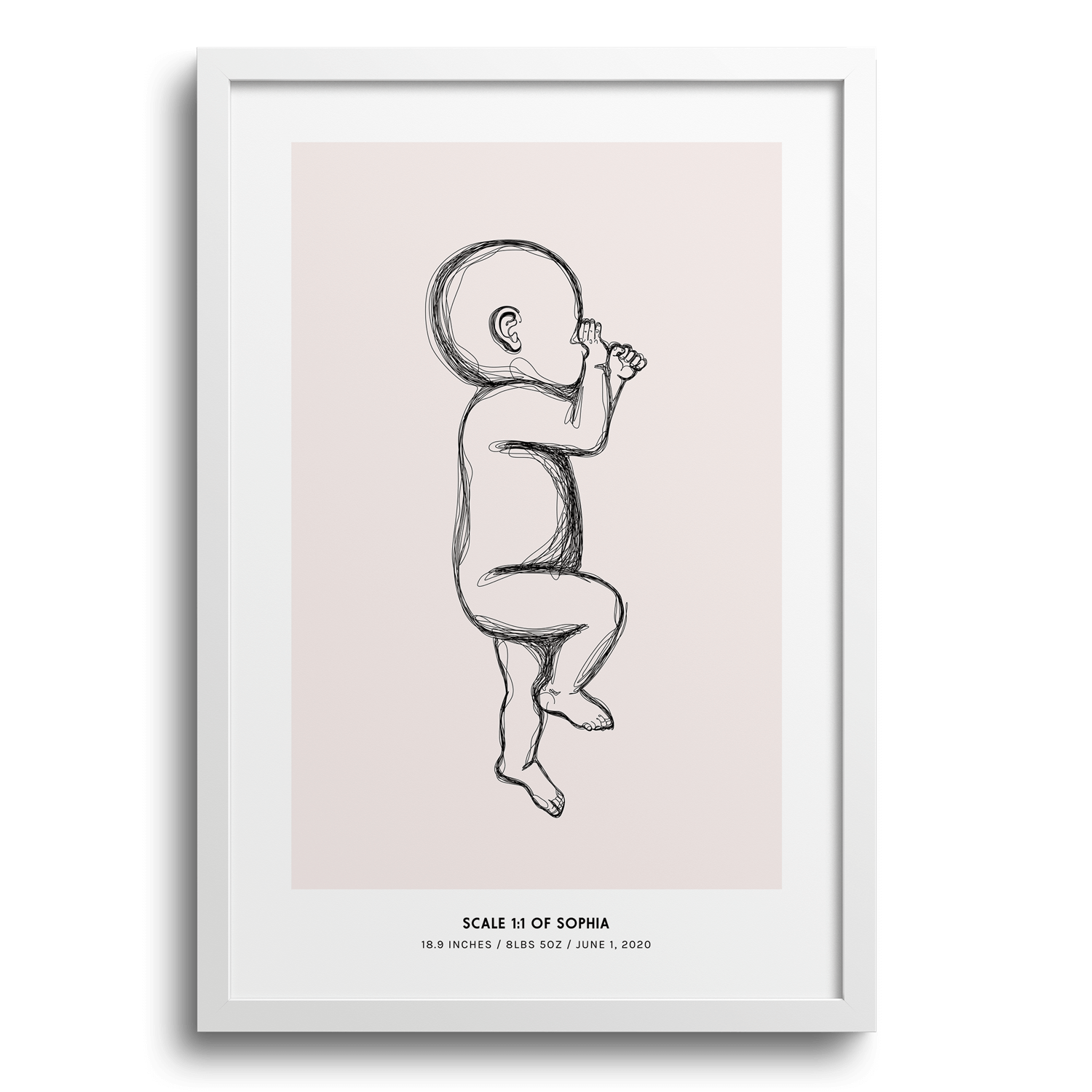 - Scaled 1:1. Actual size of your baby at birth - if your baby was 19 inches, we will print your illustration at 19 inches.