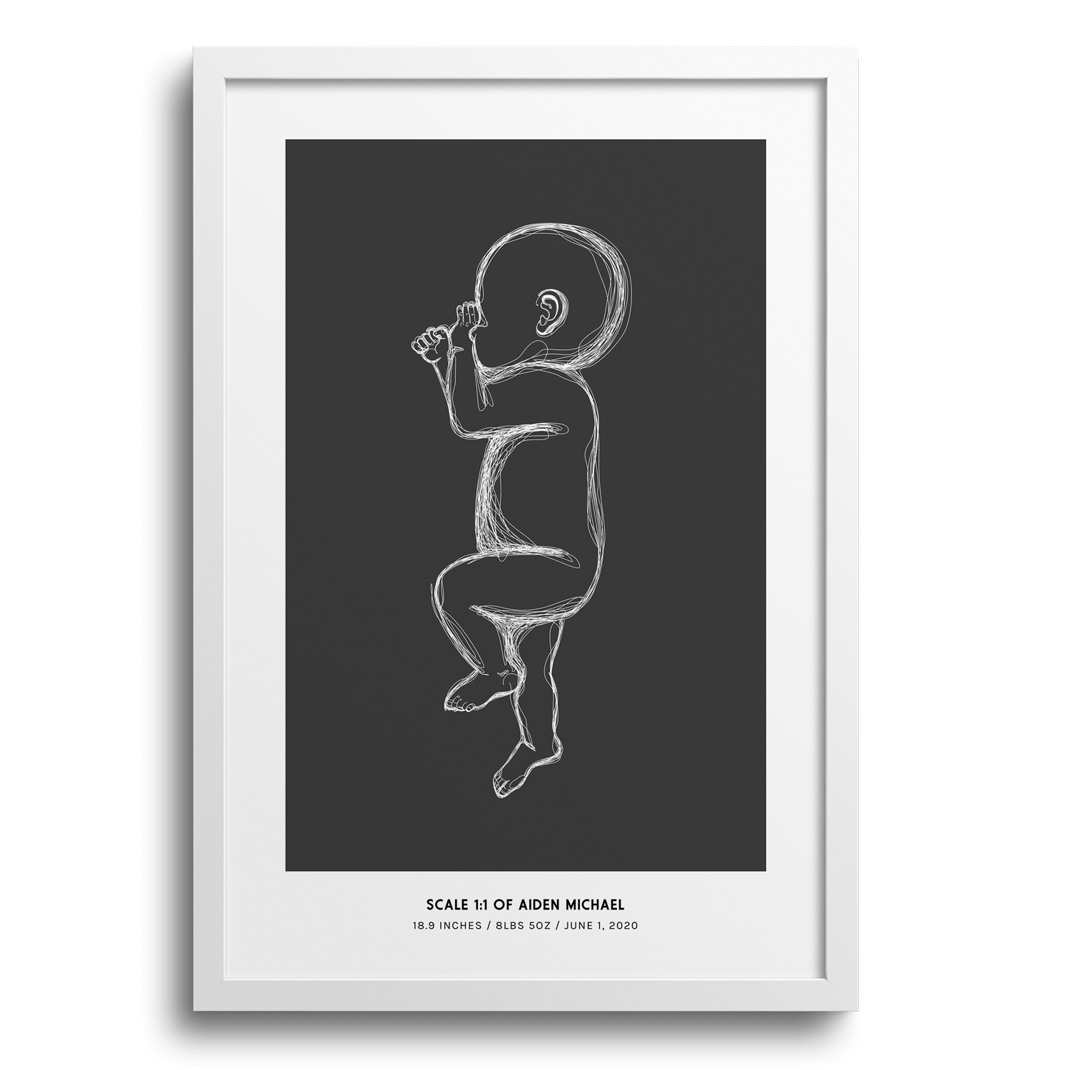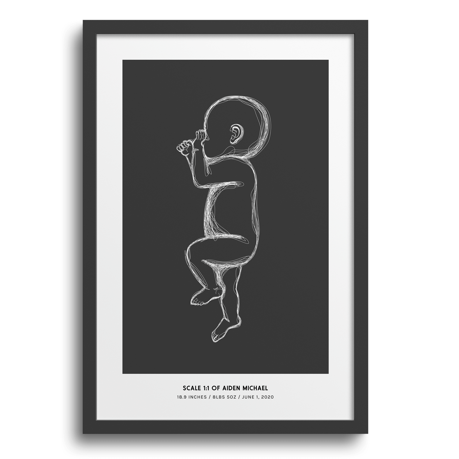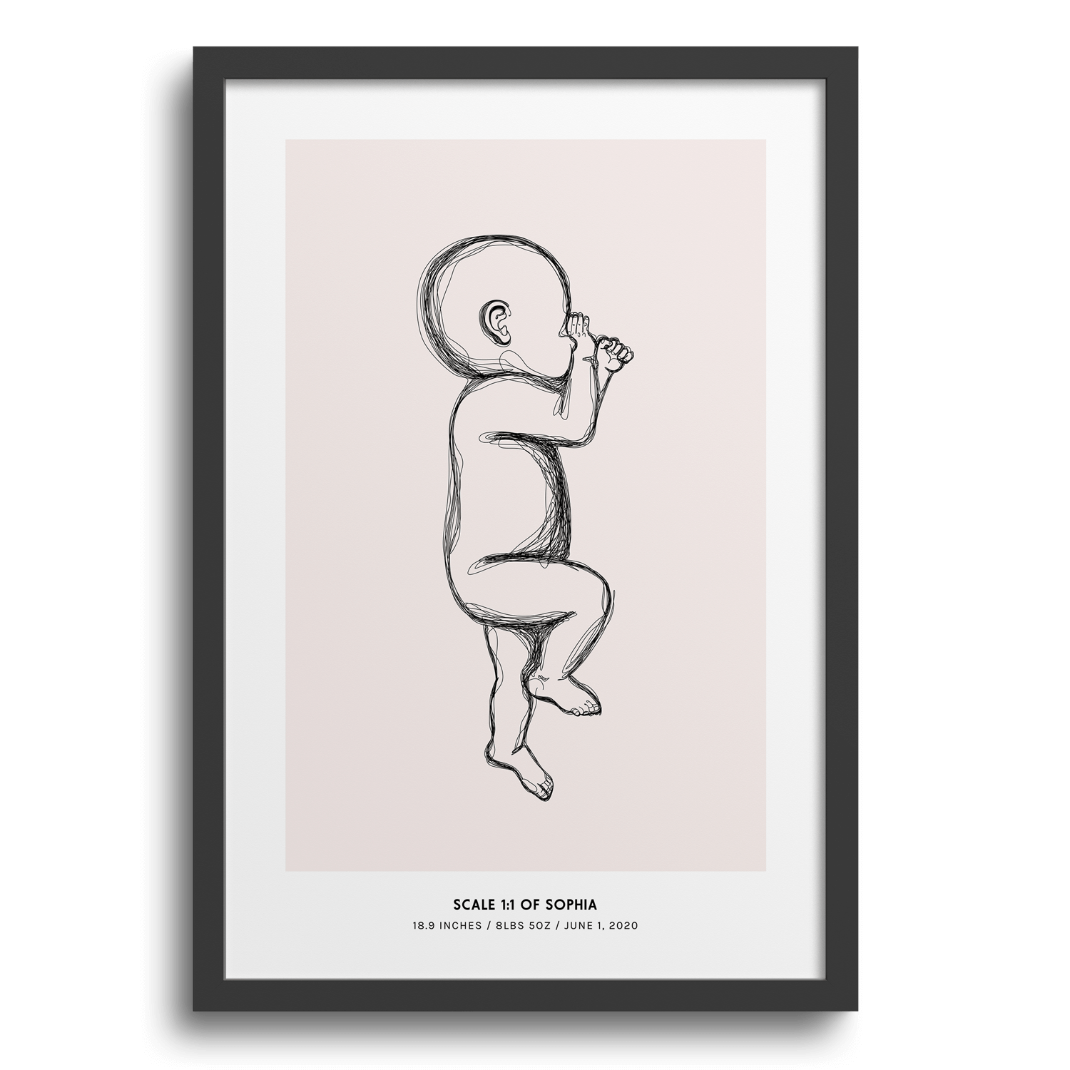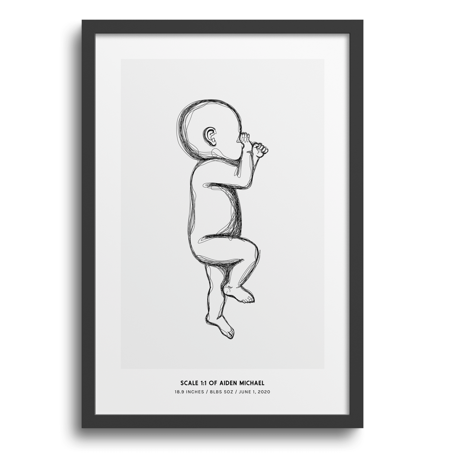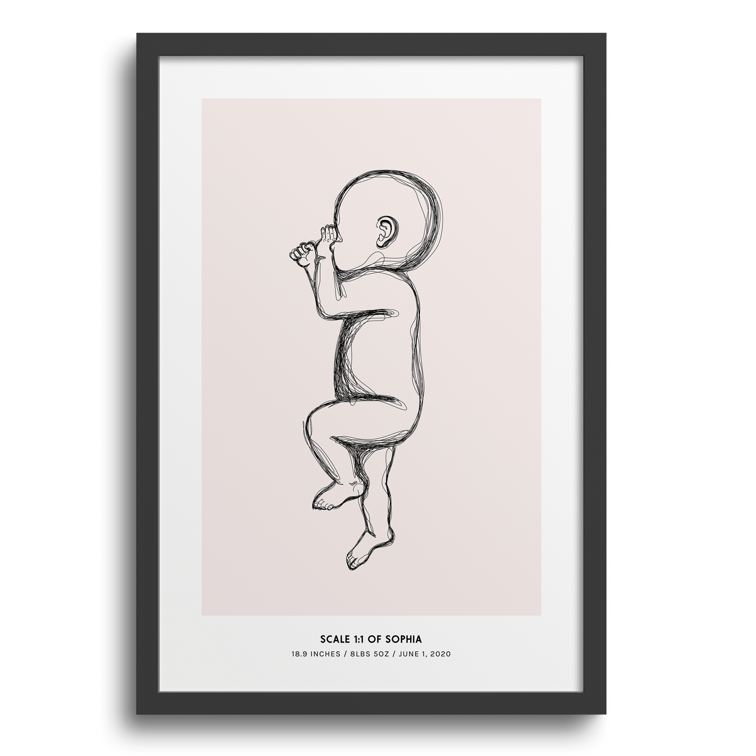 - Scaled 1:1. Actual size of your baby at birth - if your baby was 19 inches, we will print your illustration at 19 inches.