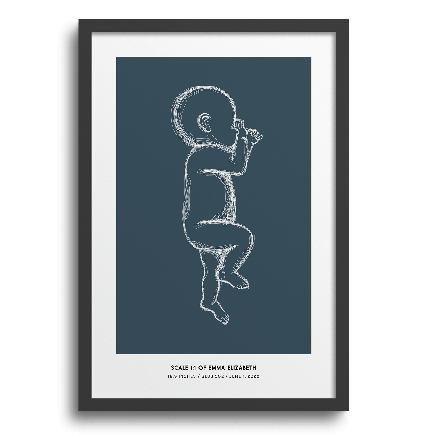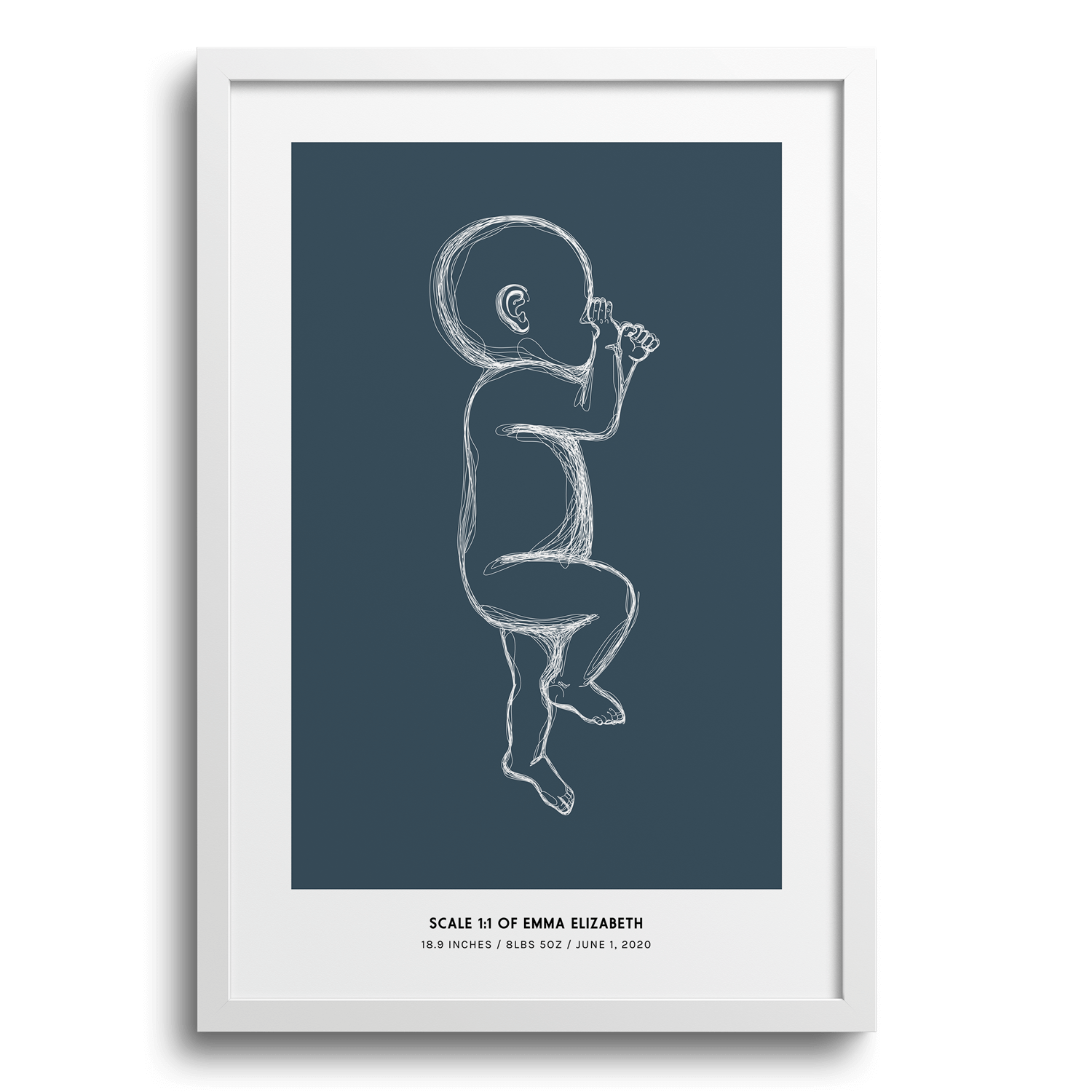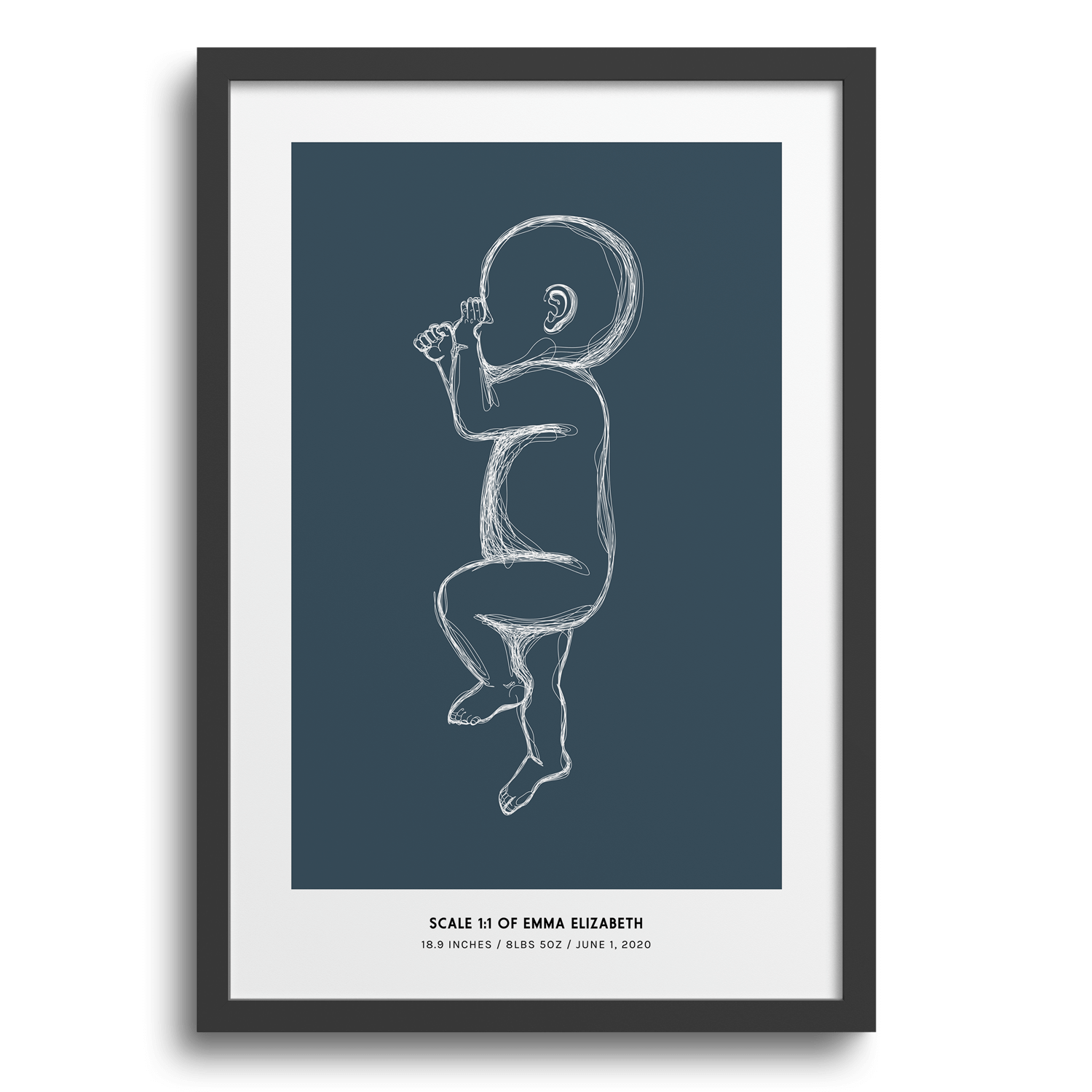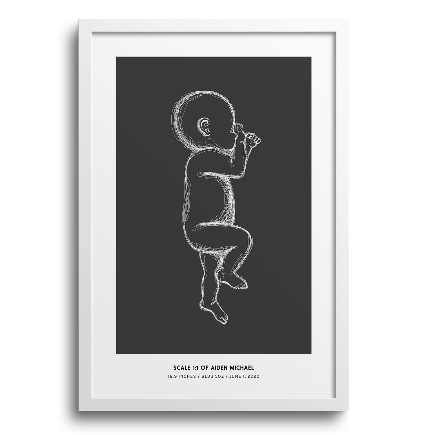 - Scaled 1:1. Actual size of your baby at birth - if your baby was 19 inches, we will print your illustration at 19 inches.