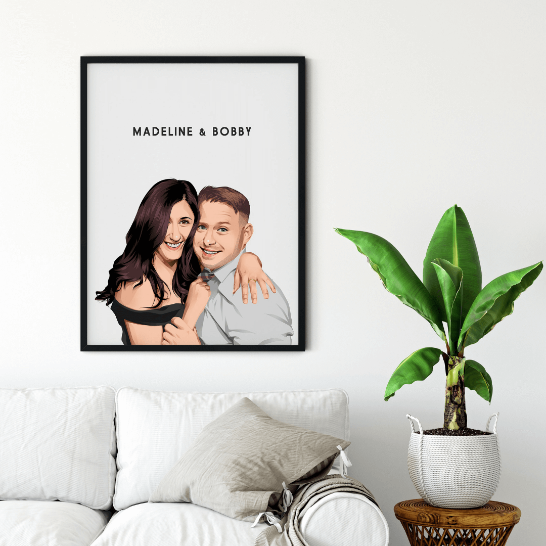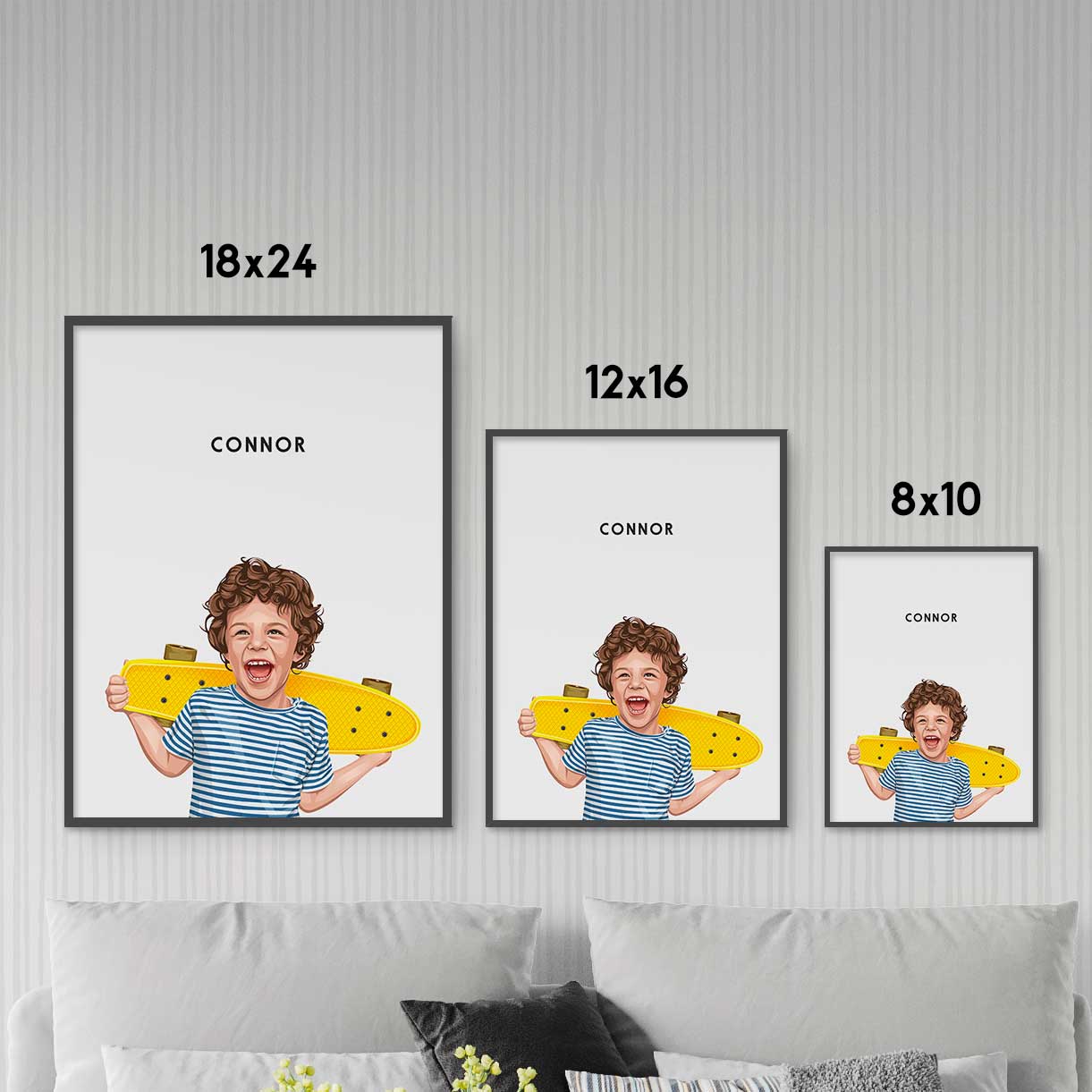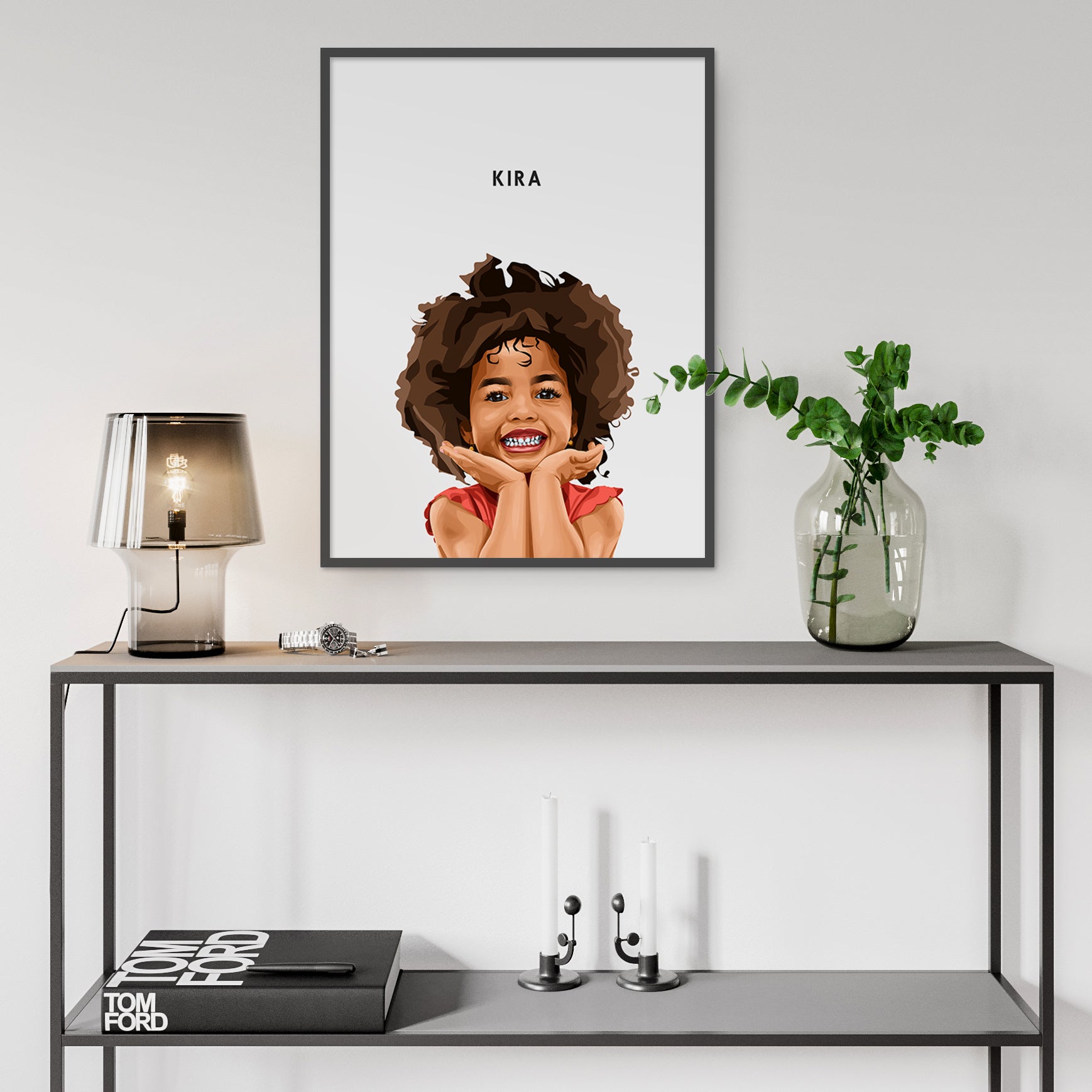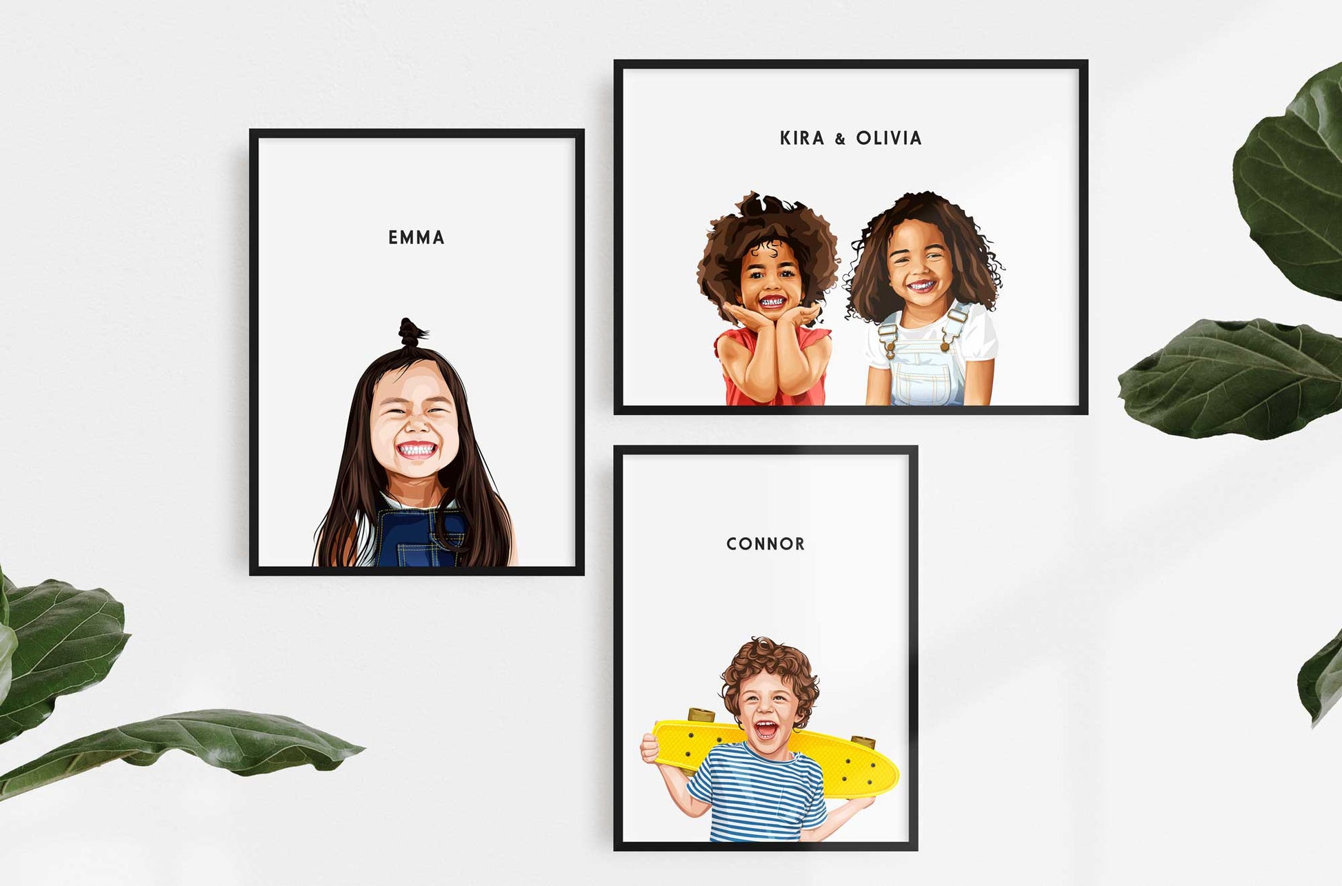 Transform a precious moment into a custom illustrated portrait! Smirky's custom illustrated family portraits are digitally-illustrated by our talented artists and expertly printed on museum-quality paper that will give your art a polished and professional look. 1" hardwood frames come in a variety of sizes and ready-to-hang. Here's some inspiration: